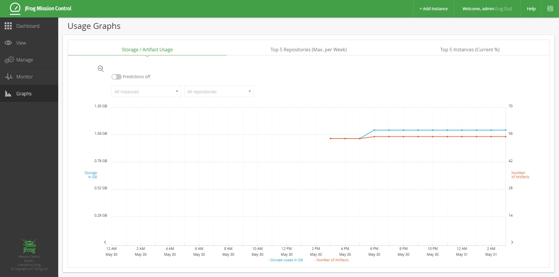该图显示了在相应列表中选择的实例和存储库中使用的存储量,以及工件的数量。在下面的例子中,图表被放大到一天的分辨率。