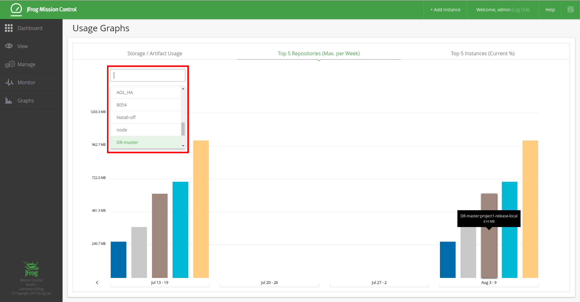 默认情况下,该图显示了由任务控制管理的所有实例以及它们各自的存储库的累计读数。但是,您可以通过在相应的列表中进行适当的选择来关注任何特定的实例或存储库。
