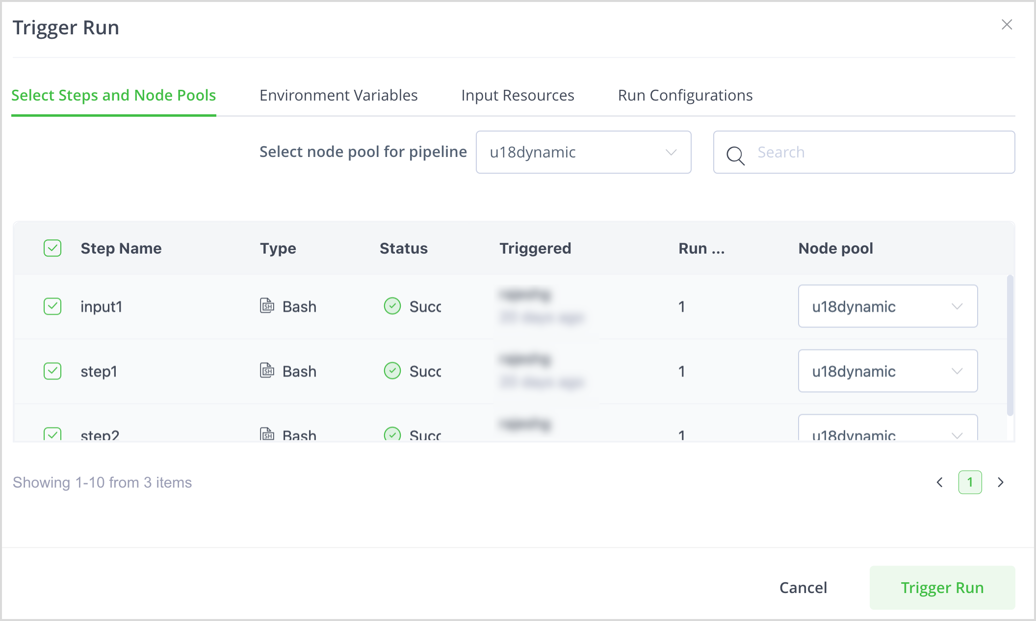 当触发运行时,您可以选择运行的特定步骤。触发运行时,只执行为运行选择的步骤。此外,您还可以为管道和单个步骤选择特定的节点池。这为您提供了选择适合特定步骤的节点池的灵活性。
