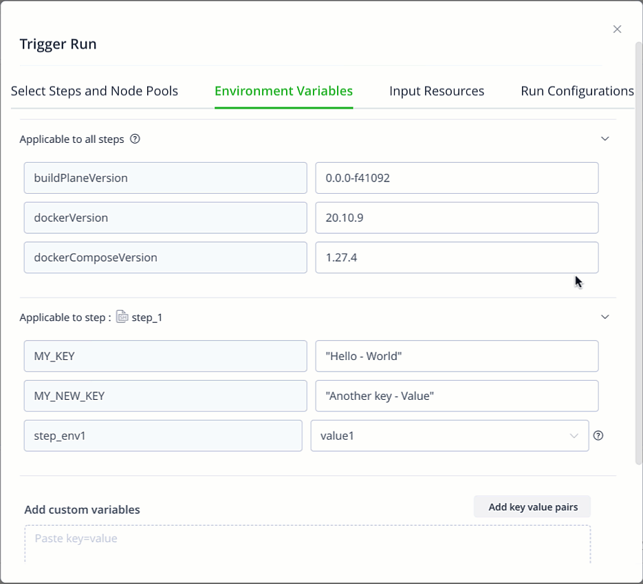 有关设置这些值的信息,请参见环境变量配置. - 添加自定义变量:该字段允许您为每次运行手动添加一个或多个环境变量。这些自定义变量可以应用于单个步骤,也可以应用于所有步骤。只有当您想要执行快速测试并且不期望使用相同的环境变量重复运行时,才使用此方法。