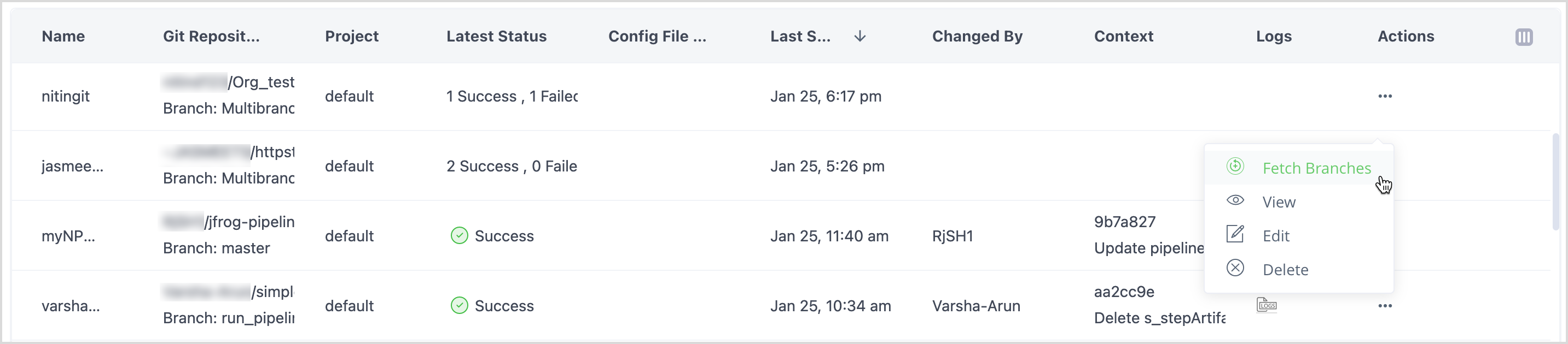 - 单击行动按钮为多分支管道,然后单击获取分支.