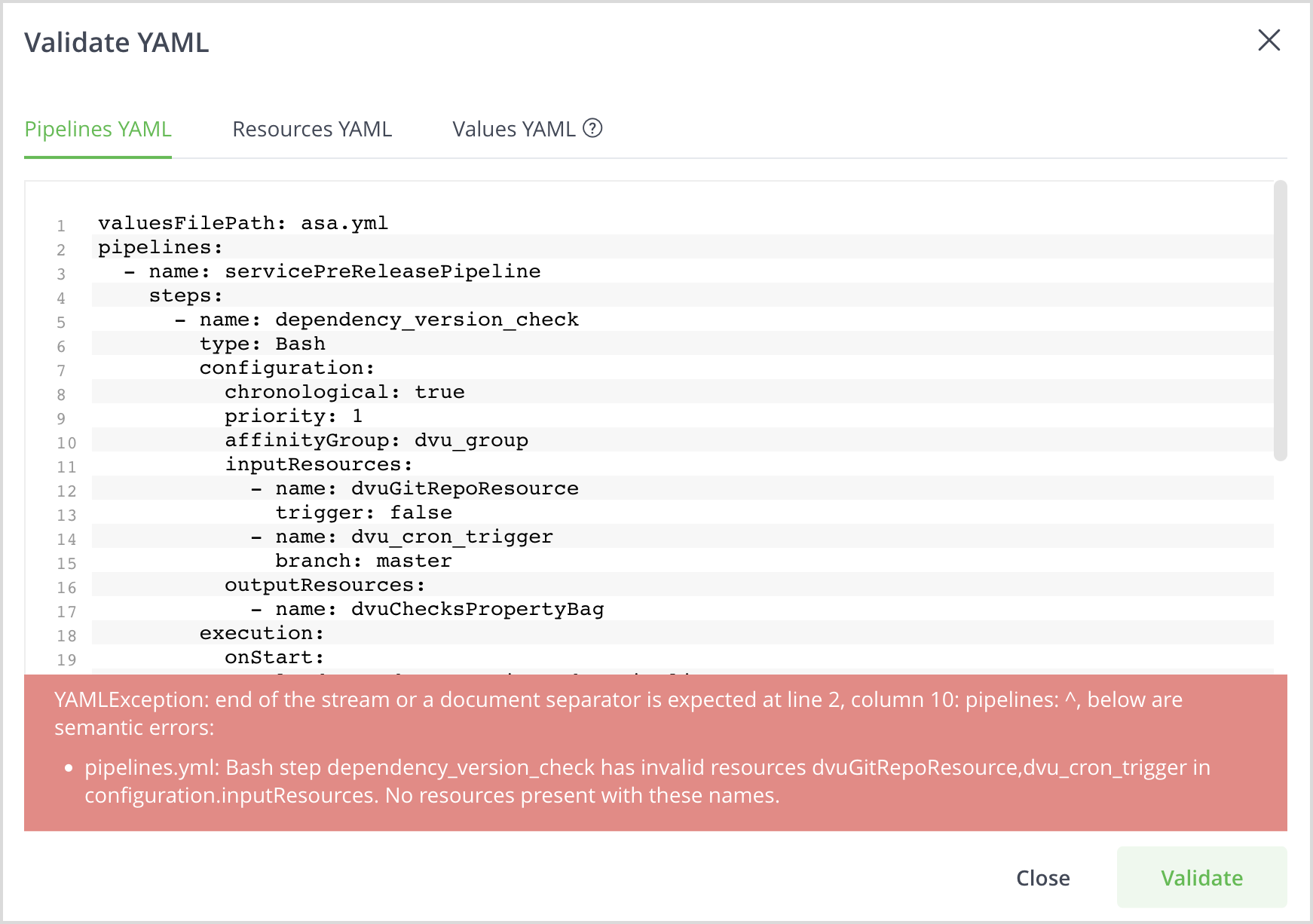 在添加管道源之前,您可以选择验证您的管道、资源和yaml值,然后将其提交给SCM。2022世界杯阿根廷预选赛赛程这使您能够获得关于管道同步错误的即时反馈。YAML验证器将对语义和语法错误进行YAML验证。