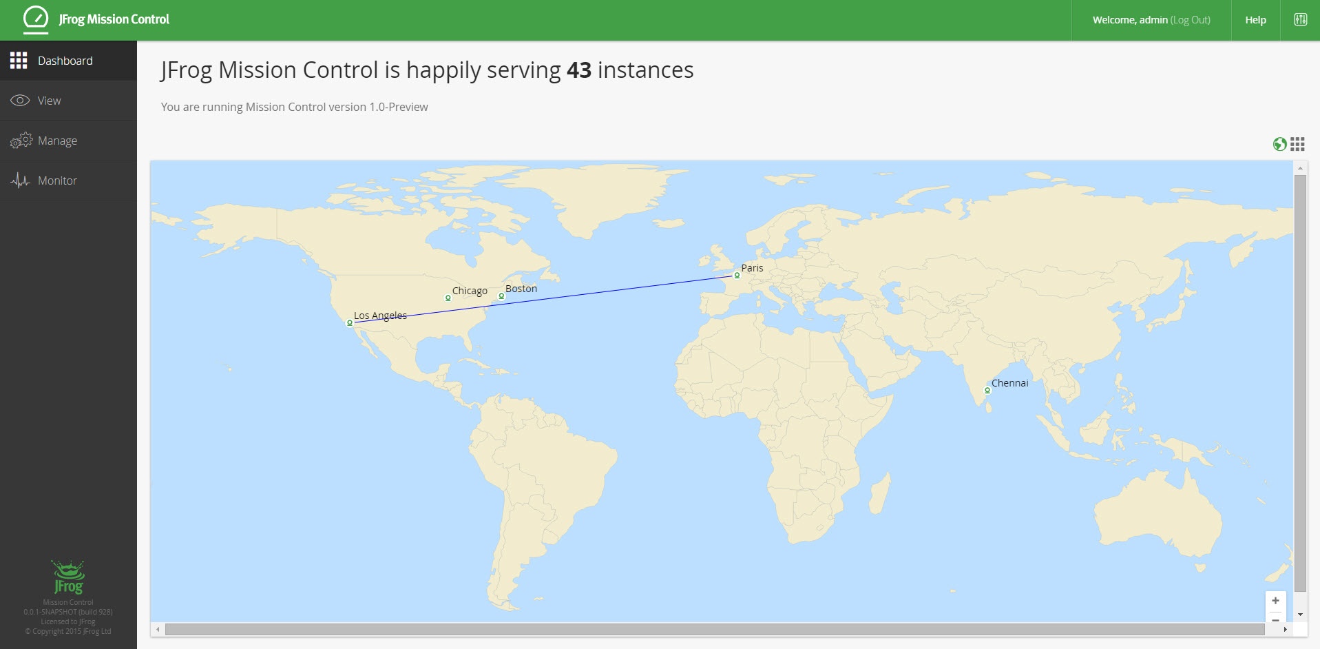 - 指示板:这是一个主屏幕,在地图或网格上显示由任务控制管理的所有Artifactory实例。