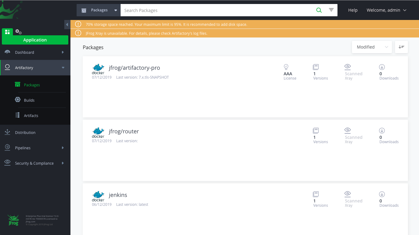View detailed information about packages and their package versions regarding the number of downloads and vulnerability scan status. Xray scanning requires an Enterprise license.
