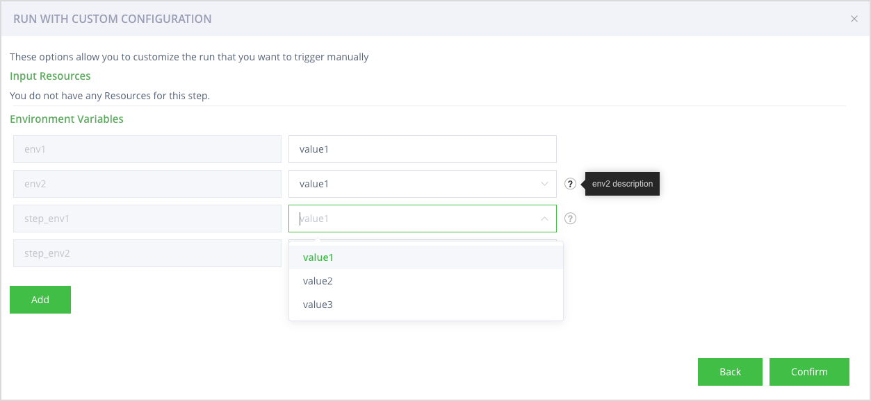 如果allowCustom设置为真正的,您可以为该字段输入任何值为跑步定义自己的价值。在上面的示例中,您可以为输入一个自定义值step_env2,除了已经定义的值之外。注意,自定义值仅对特定的运行可用。