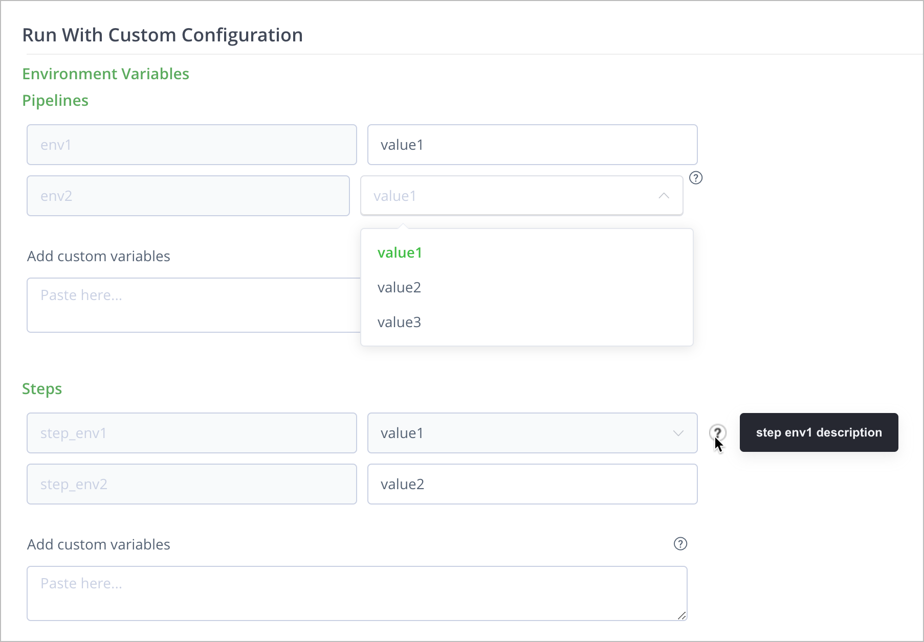 在YAML中,如果allowCustom设置为真正的,您可以为该字段输入任何值为跑步定义自己的价值。在上面的示例中,您可以为输入一个自定义值step_env2,除了已经定义的值之外。注意,自定义值仅对特定的运行可用。