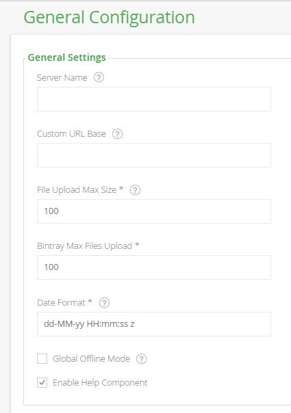General Settings下的字段允许您在Artifactory中设置各种全局参数。的?每个字段旁边的图标提供该字段的详细描述。标有红星的字段是必填项。