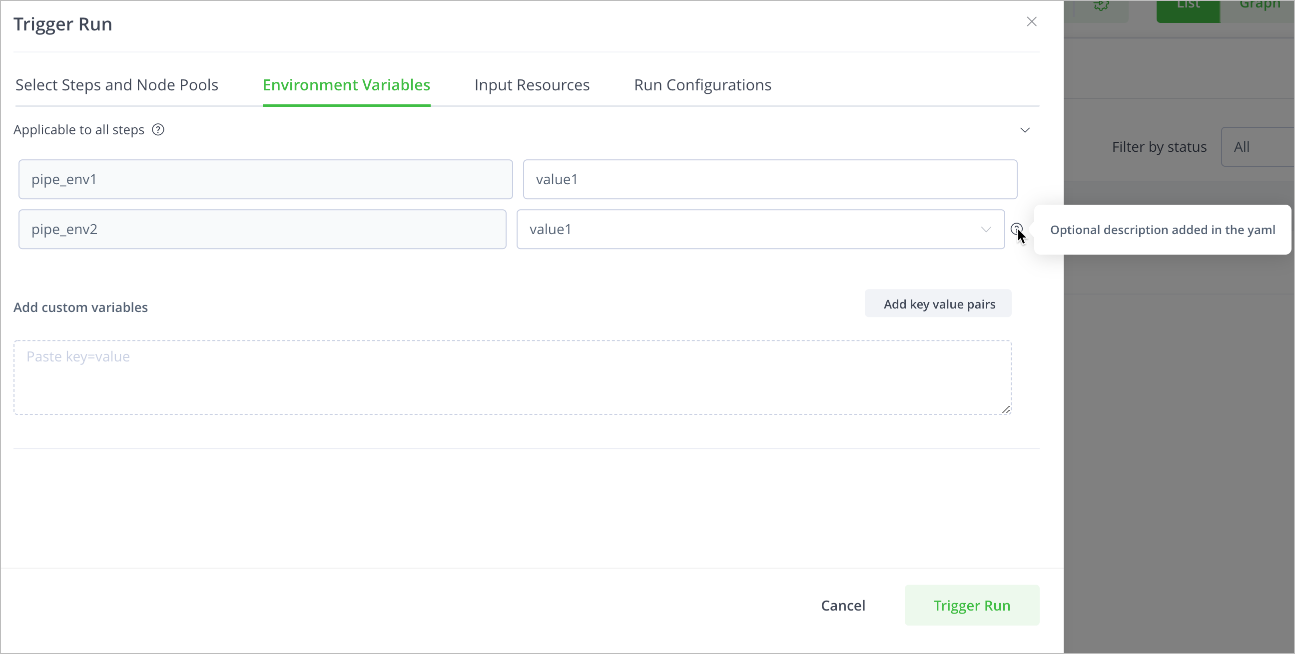 在YAML中,如果allowCustom设置为真正的,您可以为该字段输入任何值为跑步定义自己的价值。在上面的示例中,您可以为输入一个自定义值step_env2,除了已经定义的值之外。注意,自定义值仅对特定的运行可用。
