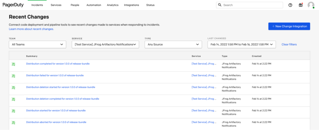 安装了集成后,PagerDuty可以从Artifactory接收webhook构建和码头工人在指定的存储库中创建、推送到注册表、删除或提升等事件。这使得ITSM能够在应用程序更新通过持续集成管道走向交付时看到它们。