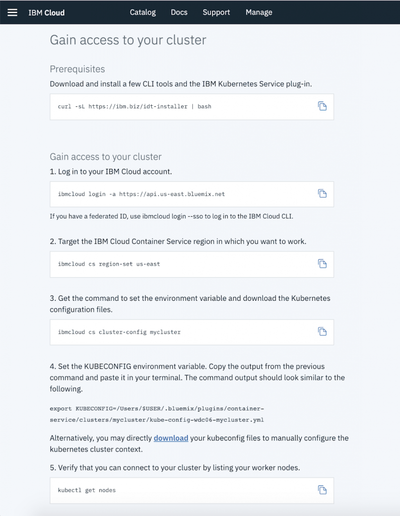 完成所有选择后,单击创建集群。 - 集群创建完成后,IBM Cloud Console将显示获得对集群的访问权限页面。