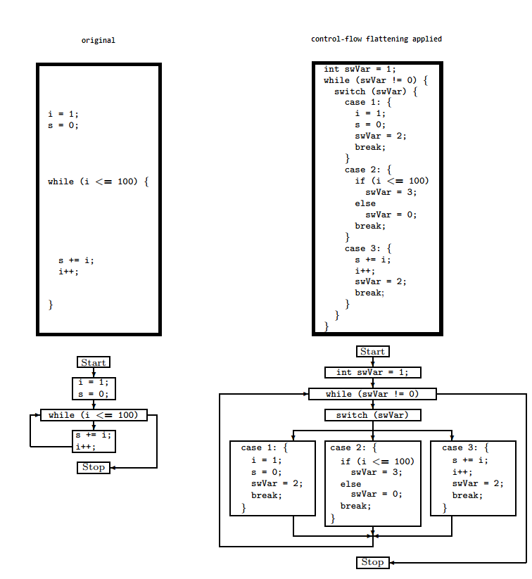 您可以在应用模糊处理后看到右侧的代码。三个代码块被压平,一个开关箱被用来控制代码的流动。新添加的变量swVar保存执行的代码块的编号。此外,在每个代码块的末尾,它的值会改变,以指示应该运行的下一个代码块。