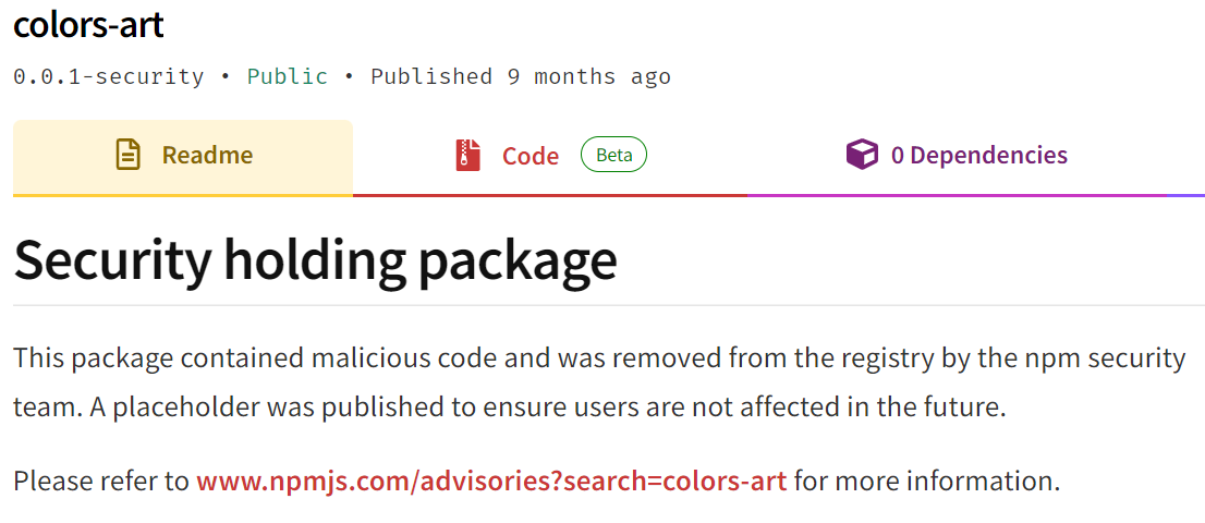 npm中的跟踪稍微好一些。报告的恶意程序包将被替换为虚拟代码,并被标记为安全持有包,正如你在下面的截图中看到的,一个名为colors-art在npm: