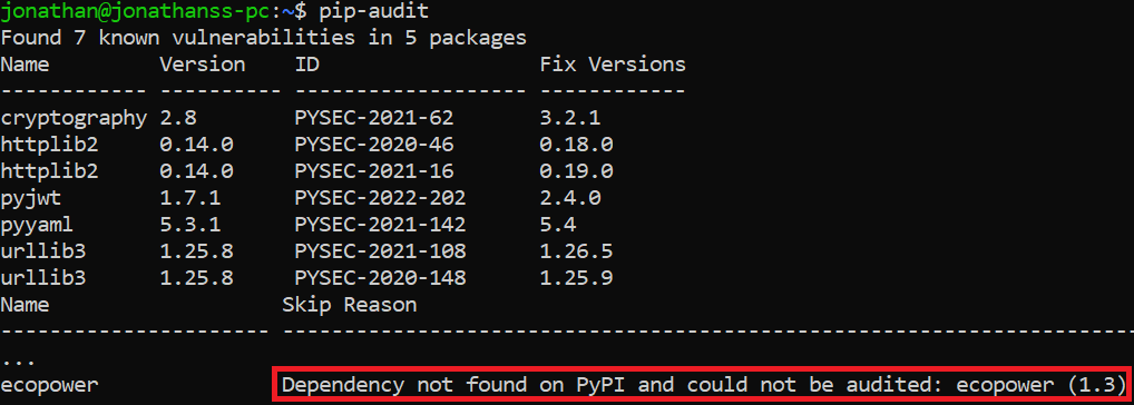 第二个问题是,即使我们希望使用存储库的数据来扫描恶意包,常见的安全审计工具也会报告漏洞,但不会报告恶意包。例如,看看以下执行PyPI工具的结果pip-audit在恶意包之后ecopower是安装。该包无法扫描(如下所示),因为它被报告为恶意后从PyPI存储库中删除: