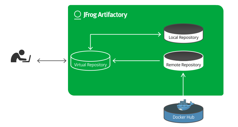 从1.0版本开始,Artifactory中就有了虚拟存储库。最近,我们还添加了to的功能将工件部署到虚拟存储库.这意味着虚拟存储库可以作为Docker映像的上传和下载的单一入口点。是这样的: