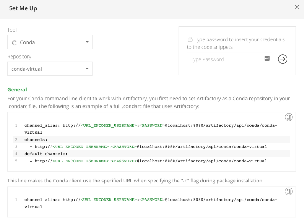 直接在Artifactory UI中解决依赖关系。当在Artifacts Tree Browser中选择Conda存储库时,单击帮我介绍查看可用于发布Conda包或配置Conda客户端以使用选定的存储库解析工件的代码片段。