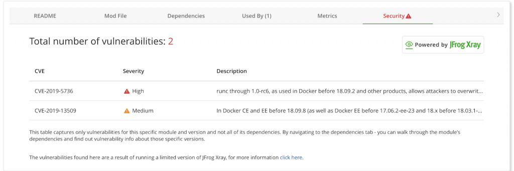 Luckily, GoCenter can now tell you when any Go module has a known vulnerability. We’ve brought the power ofJFrog Xray’ssecurity scanningto this reliablerepository of Go modulesfor the Golang developer community.