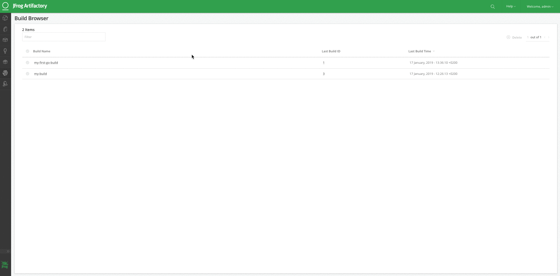 $Jfrog rt go build go——build-name=my-first-go-build——建立若干= 1