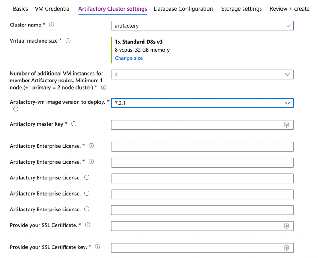 在这个选项卡中,您将为Artifactory将在其中运行的集群定义设置。这包括集群的名称、要部署的节点数量,以及要在其中运行的Artifactory VM映像。