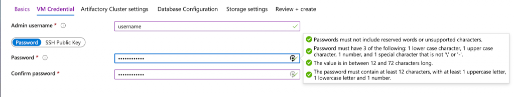 在这个选项卡中,您必须为将要为JFrog Artifactory运行而创建的VM指定一组登录凭据。为虚拟机管理员输入有效形式的用户名,可以定义12个字符的密码或SSH公钥。