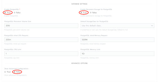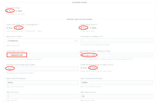 向下滚动以设置配置选项.设置名称,启用持久存储,并将持久卷大小设置为足够大的值以适应您的预期需求。< br /设置容器的图片来使用默认映像,而服务和负载均衡设置使用NGINX服务器,分配artifactory-ha-tls秘密和art-nginx-conf在前面的步骤中创建的ConfigMap。