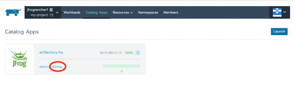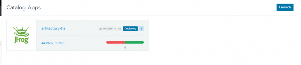 - 安装可能需要几分钟才能完成。当完成时,它将呈现JFrog人工工厂-ha应用程序为活跃的. Artifactory HA安装的URL显示为hotlink(例如,443/tcp, 80/tcp)。单击链接以访问Artifactory HA应用程序。