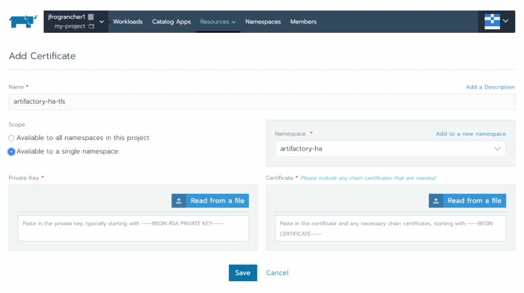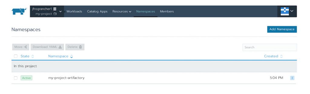 可以将Artifactory安装到默认的在添加集群时自动创建的牧场主项目。但是,创建一个Rancher项目和命名空间让Artifactory来磨合