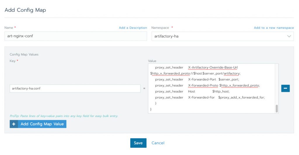 Artifactory将需要一个ConfigMap用于其负载均衡器所需的一般配置信息。