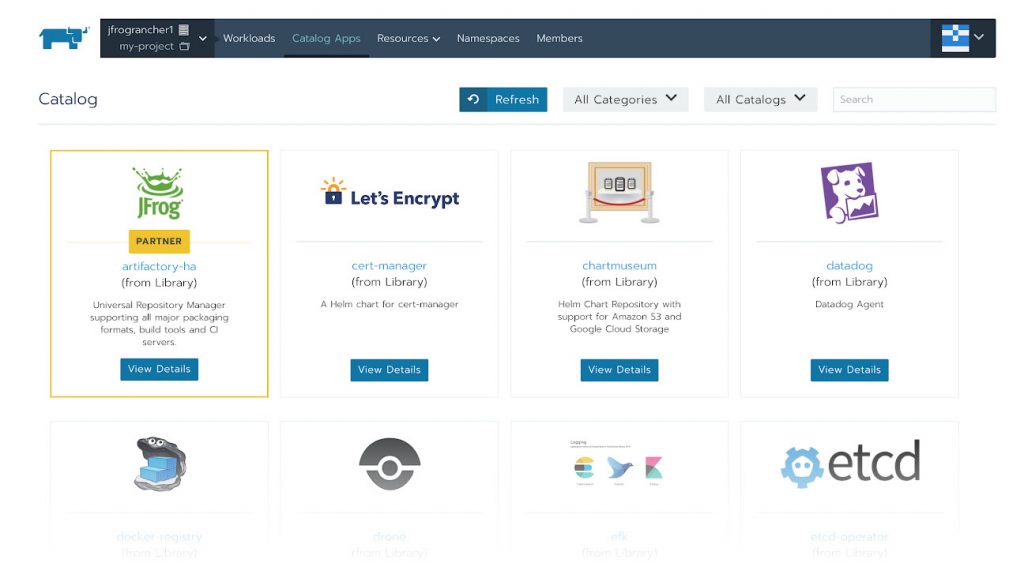 Rancher通过其目录对Artifactory进行了集成,这使得在您的组织中需要的所有集群之间部署和管理混合Kubernetes Registry特别容易。