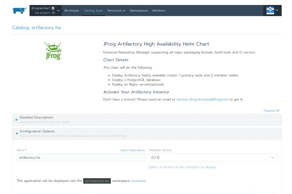 一旦您有了可以运行Artifactory的集群、项目和名称空间,您就可以通过Rancher的应用程序目录轻松地安装它。