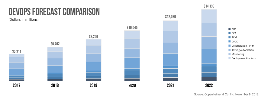 我为什么这么说?你只需要看看那些大公司、潮流引领者、市场领导者——在许多情况下,他们直接告诉我们。在2018年的两个季度里,我们看到微软和微软等大公司的交易额超过600亿美元IBM收购红帽等公司和GitHub。微软进一步改变了命名惯例,只围绕产品和DevOps套件。hth华体会最新官方网站谷歌Cloud等具有全球影响力的公司的领导者纷纷辞职,取而代之的是那些年销售额达60亿美元的首席执行官。这些都不是心血来潮的小举动。它们是移动的地壳板块。我们真的认为这些“大男孩”是在争夺地位,花费数百亿美元来争夺每年140亿美元的市场份额吗?几乎没有。他们的收购和人事变动表明,他们认为这个市场还只是皮毛。当你考虑物联网和“开发者到设备”的移动,以及仅在该市场中TAM的11-12位数估计时,你就会开始看到一个高速增长的途径。