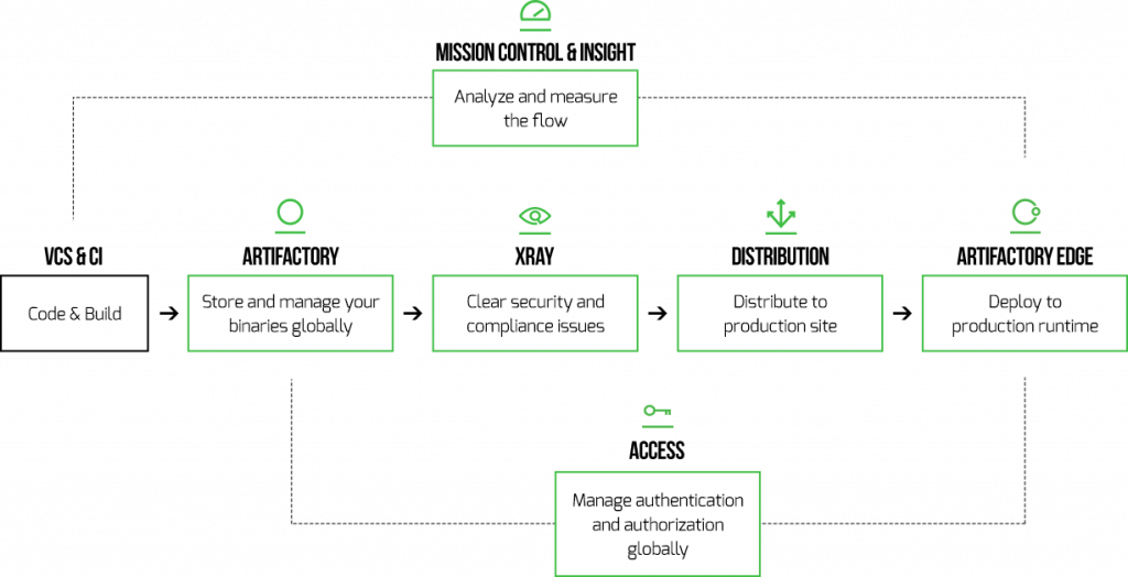 新引进的JFrog企业+平台是一个完整的解决方案,涵盖了在多站点开发环境中创建安全、可靠和可跟踪的软件版本所涉及的所有步骤。它由最好的JFrog产品提供支持,具有与源代码版本控制以及持续集成和部署工具相结合的创新元素。