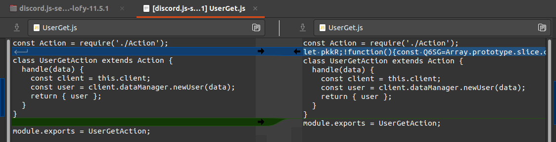 恶意软件的作者以原始的discord.js库为基础,将混淆的恶意代码注入到文件中src /客户/行动/ UserGet.js: