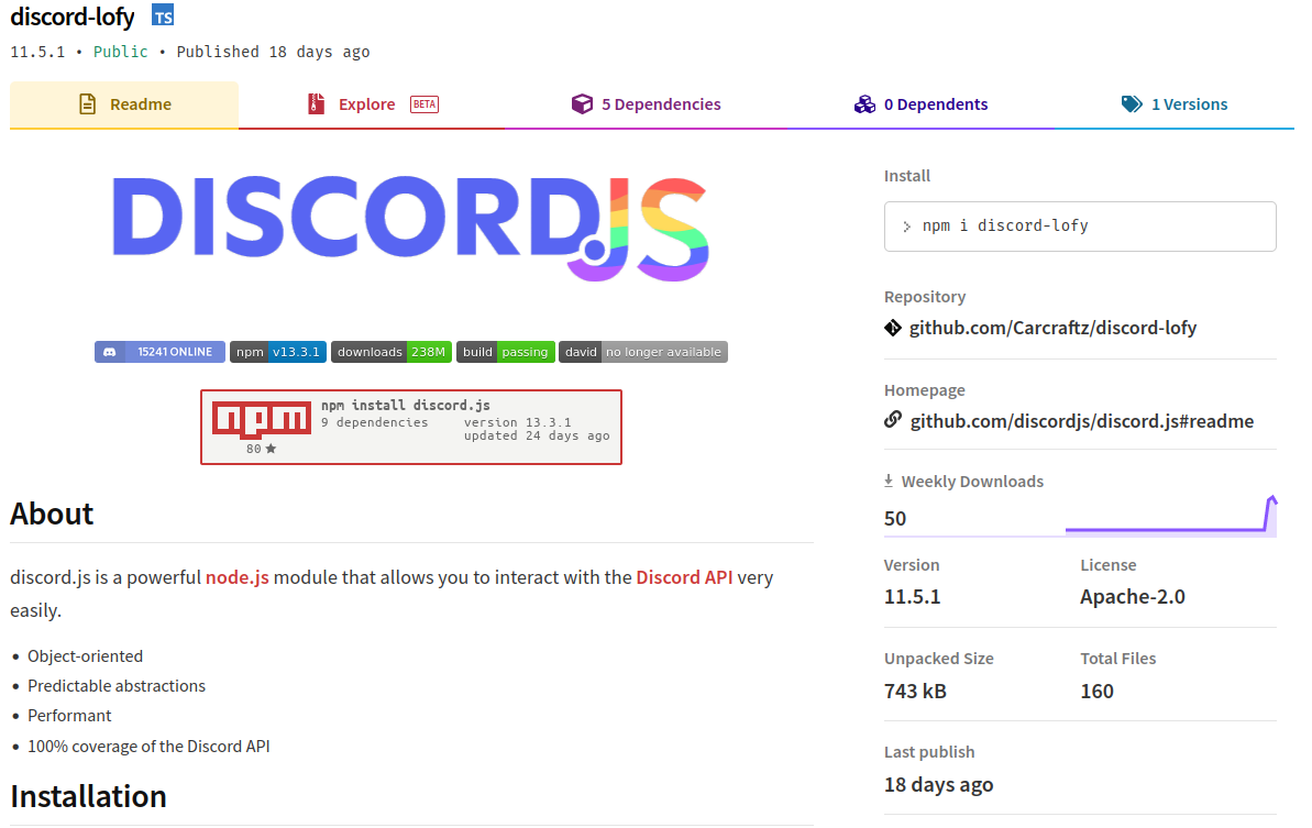 的discord-lofy和discord-selfbot-v14包由同一作者(davisousa)发布,并假装是流行的合法库的修改discord.js,它支持与Discord API的交互。