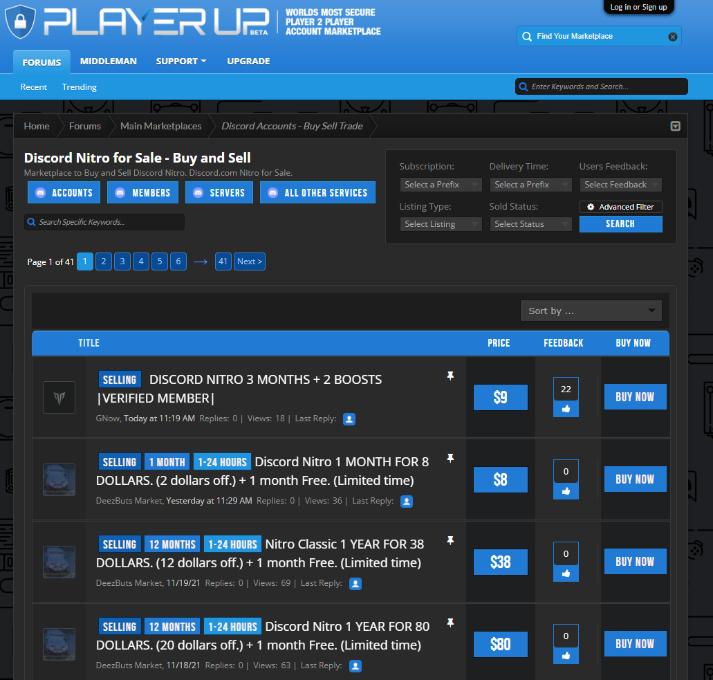 Discord运营着一项名为“不和硝基。这项服务目前每年收费100美元,为用户解锁了几个美容选项(表情符号、徽章等),以及“提升”所选服务器的选项,以提高该服务器上的通话和视频质量。攻击者的目标可能是购买Nitro的Discord帐户,以便在在线市场上廉价转售。例如,这可以在“playerup.com”市场中看到: