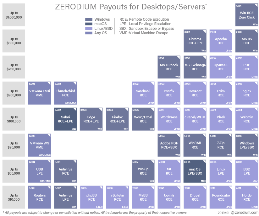 上表显示,一个远程代码执行漏洞的成本可能高达100万美元,其中针对Windows的零点击RCE漏洞是最昂贵的。该表显示了利用漏洞时的复杂性和高赏金/回报。