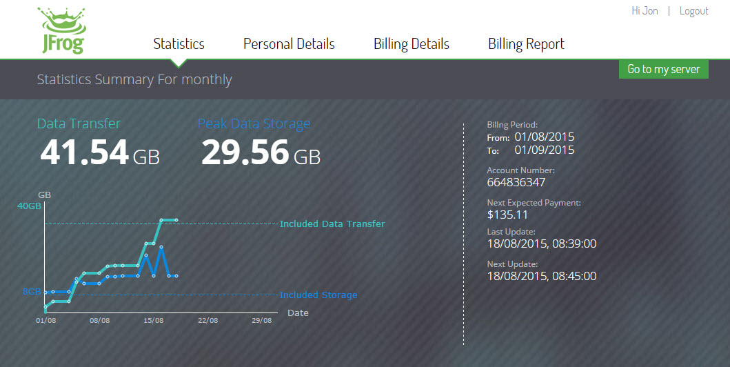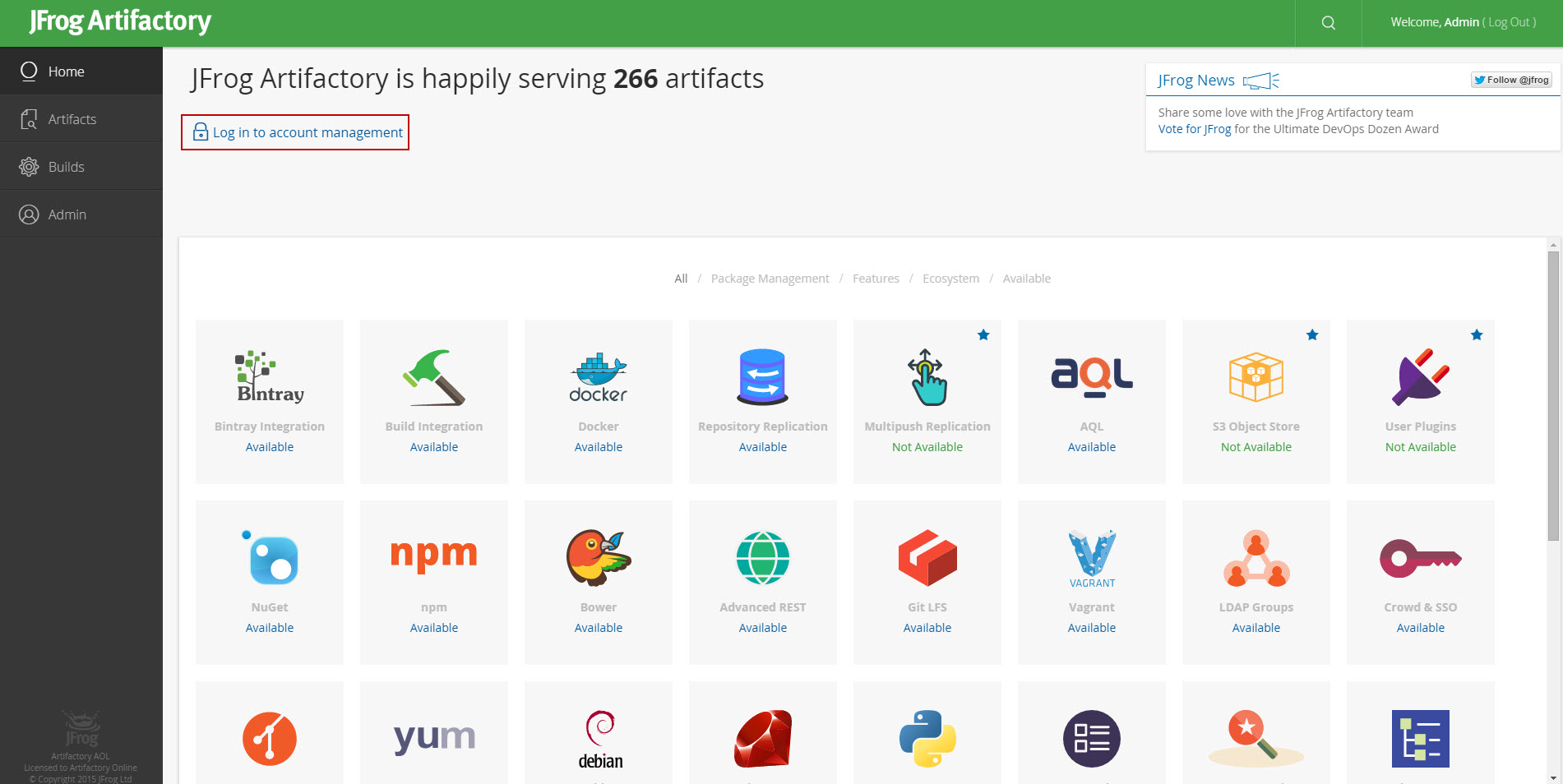 您的Artifactory Online帐户和Artifactory Online服务器实例现在作为两个完全独立的实体进行管理,每个实体位于不同的URL,并具有到另一个的方便链接。与使用Artifactory Online作为存储库管理器相比,这避免了管理帐户时的混乱。想要从仪表板转到管理服务器吗?点击“转到我的服务器”。想回去吗?只需在Artifactory Online主屏幕上点击“登录帐户管理”即可。