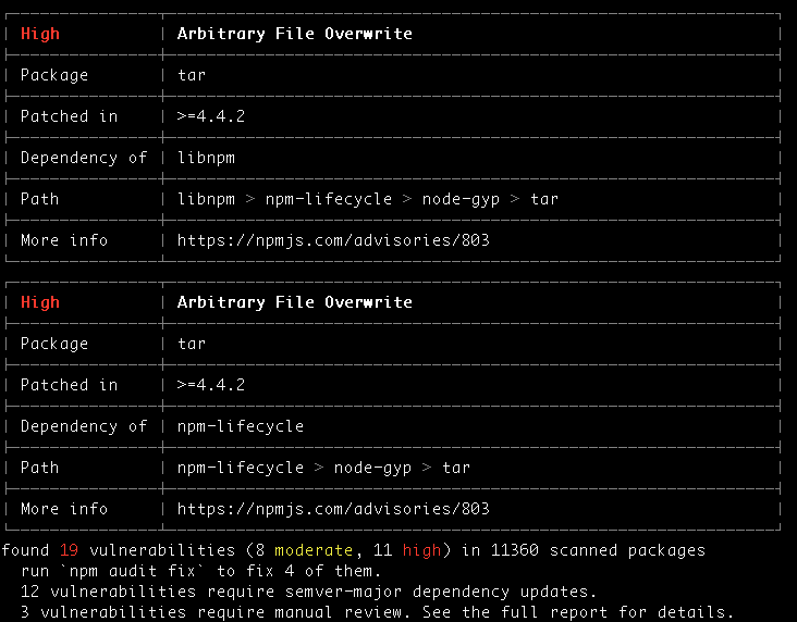 的NPM审计命令生成一个审计报告这提供了所有已知的摘要安全漏洞在你的NPM包和依赖项中。它还提供了npm命令和建议,一旦这些漏洞被应用,就会修复它们。此外,' npm audit fix '命令甚至会尝试在可能的情况下自动应用这些建议。安全信息从npm审计信息提供程序中检索,例如npmjs.org.
