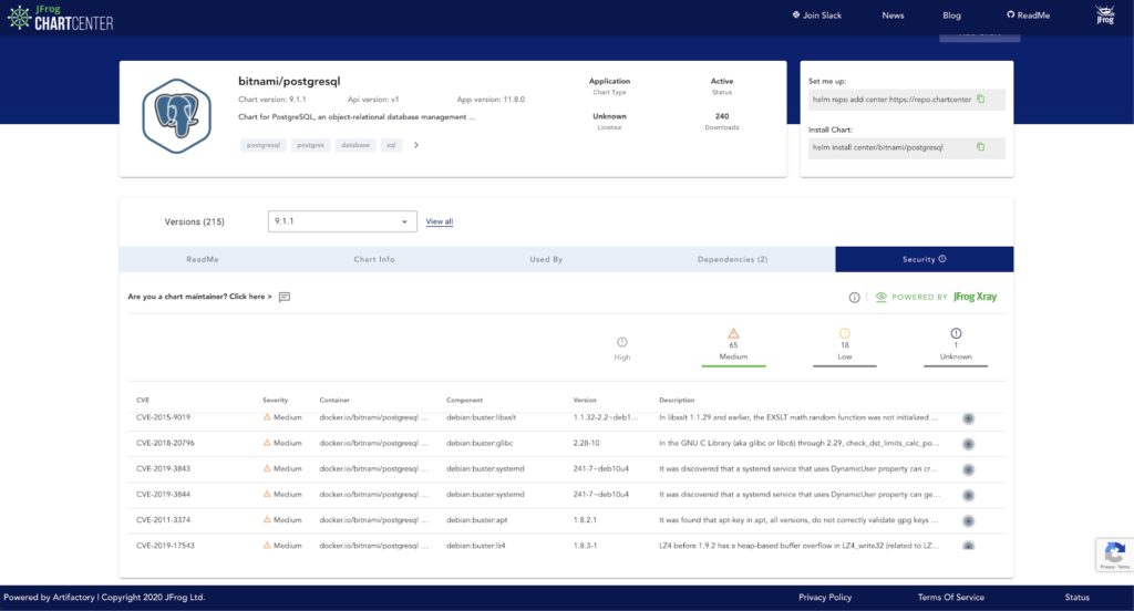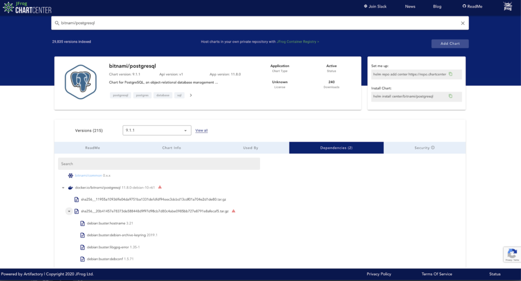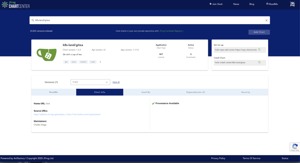 JFrog ChartCenter为公开可用的k8应用程序的Helm图表提供了可靠的来源。当一个Helm图表包含在ChartCenter中时,出处文件的可用性会在chart Info选项卡中注明。