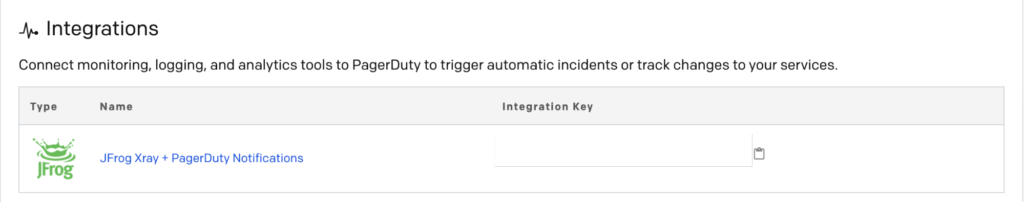 将Xray的PagerDuty集成添加到新的或现有的PagerDuty服务中。注意PagerDuty提供的集成键。