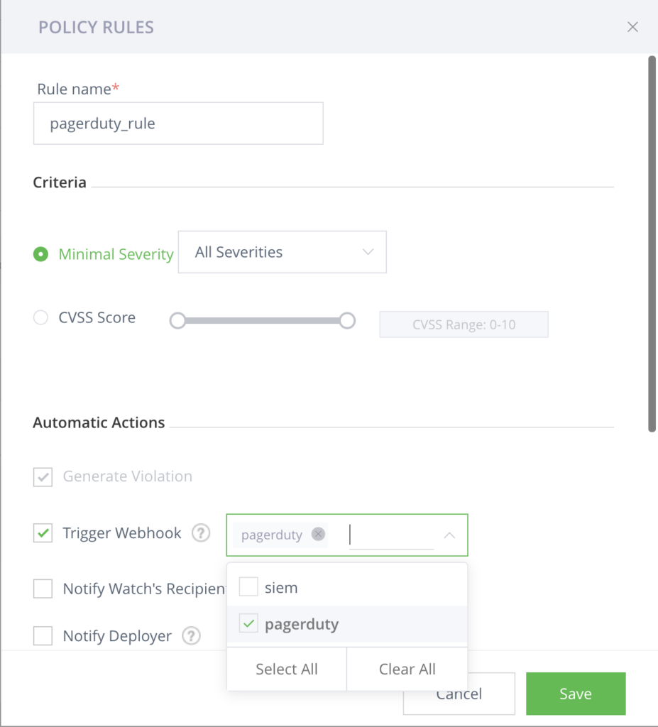 对于要为其发送事件报告的每个x射线策略设置,配置策略规则来触发Webhook,并选择您创建的PagerDuty Xray集成webhook。