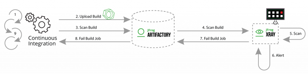 这就是为什么x射线扫描是JFrog平台的一个组成部分。安装后,它与Artifactory紧密集成,因此始终正确触发监视,并且安全元数据自然地流向构建。