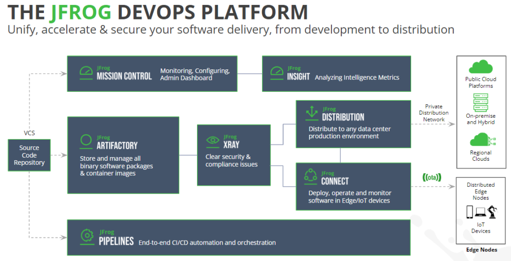 With theJFrog DevOps Platform, you can unify, accelerate & secure your software delivery, from development to device. The JFrog Platform offers deeper Dev. + Sec. + Ops. integration, in a flexible and expandable platform that delivers increased security, visibility, and control on-premises, in the cloud, across multiple clouds,and at the Edge.