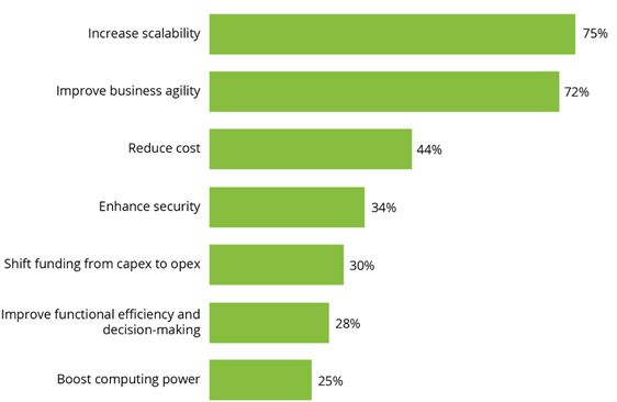 Laut den Erkenntnissen und Analysen für cio von Deloitte aus dem 2018年11月* lagen die beiden wichtigsten Faktoren für die Cloud-Einführung in einer erhöhten Skalierbarkeit (75%) und in größerer geschäftlicher Agilität(72%)。Kostensenkung露天广场。