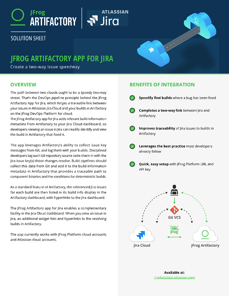 The path between two clouds ought to be a speedy two-way street. That’s the DevOps pipeline principle behind the JFrog Artifactory App for Jira, which forges a traceable link between your issues in Atlassian Jira Cloud and your builds inArtifactoryon theJFrog DevOps Platformfor cloud.