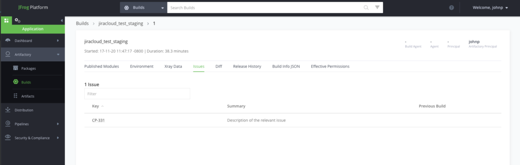 - View an issue in Jira, and you can see which builds in Artifactory have the fix, and click one to view it in Artifactory, where you can download the artifacts.