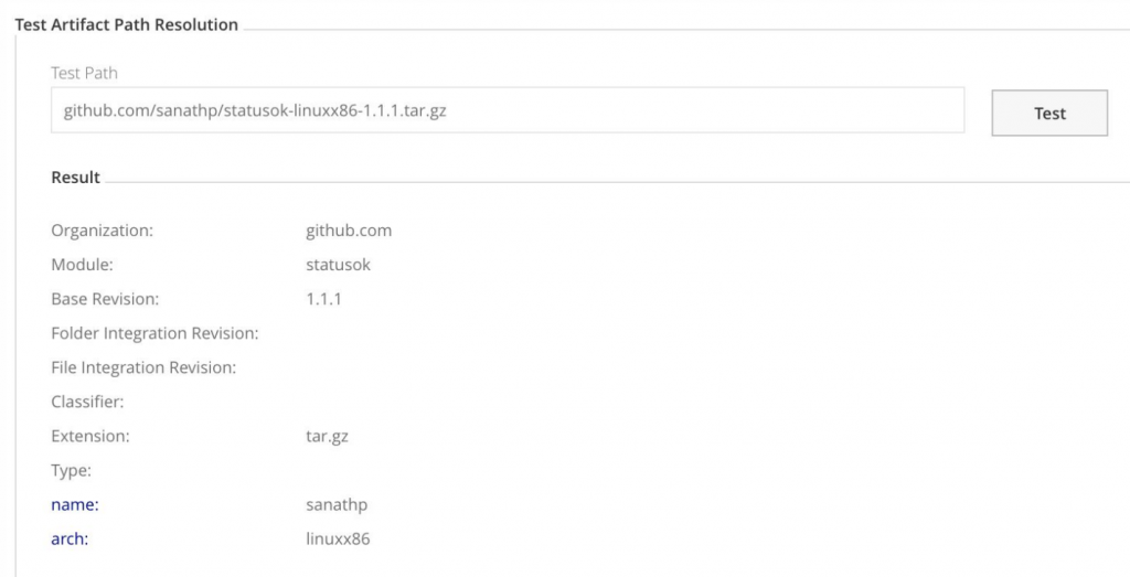 既然你们配置拓扑personnalisée, il convient de tester la résolution du chemin d 'accès à l ' artifact pour confirmer comment Artifactory générera les information du module à partir du chemin d 'accès en utilant les définitions de la topology。
