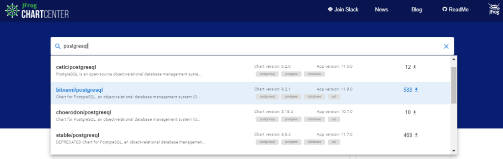 Par exemple, la recherche del’application de base de données PostgreSQLdans ChartCenter permet de trouver plusieurs correspondances :
