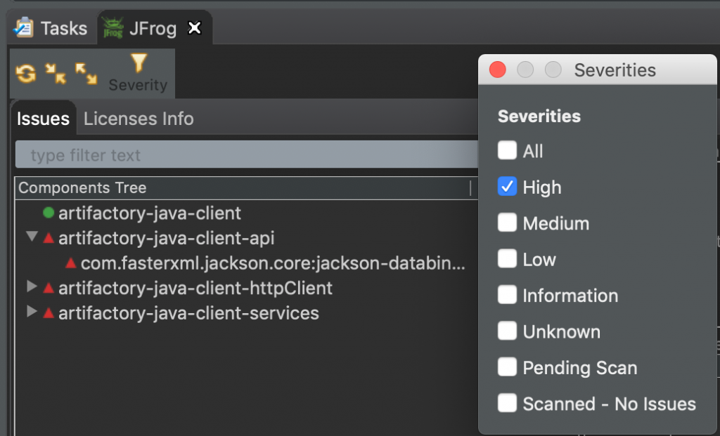 一旦你打开JFrog选项卡中,您可以看到问题Xray已经在依赖组件中识别出来了。您可以筛选结果,以便仅显示与严重程度风险。