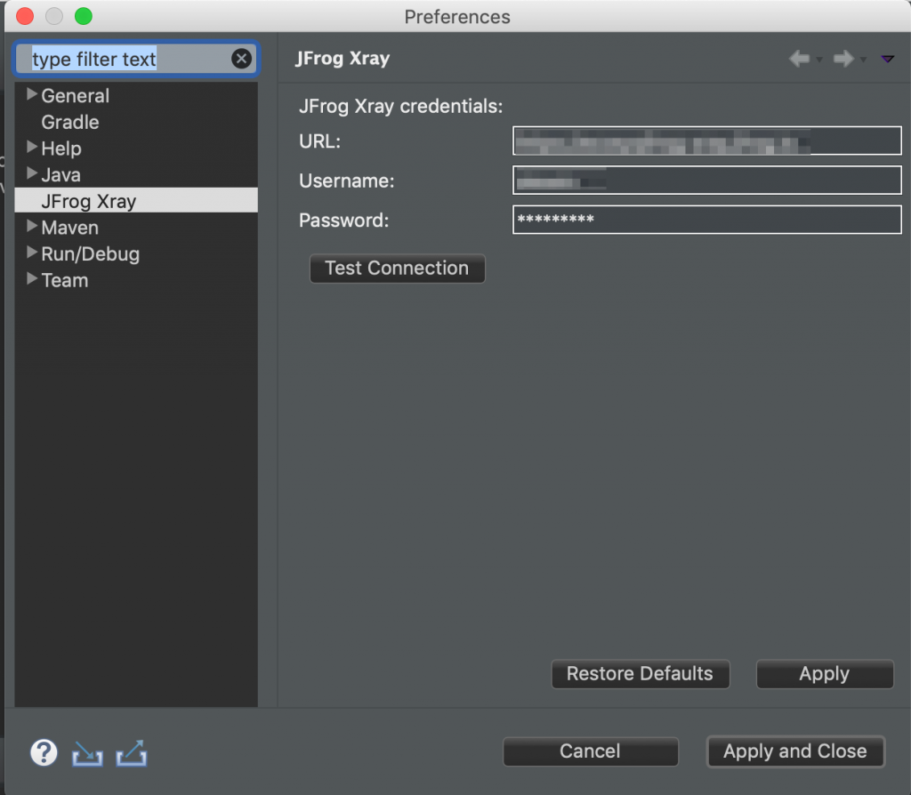 一旦安装,你就可以连接插件到您的JFrog Xray实例通过设置其URL和登录凭据在其首选项。完成后,您可以单击测试连接要确认设置是否有效,请单击应用设置。