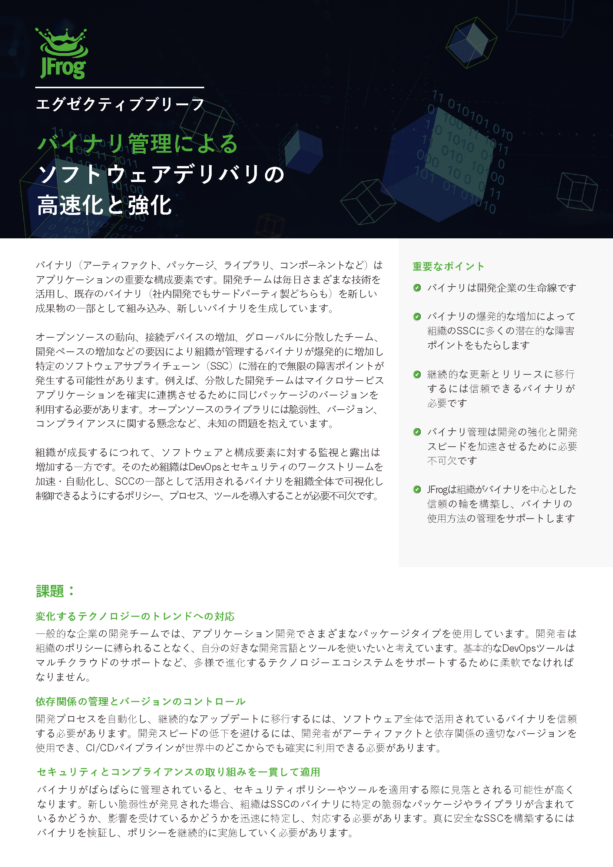 本書では、課題、JFrogを使った解決法、今すぐ大規模なバイナリ管理の準備をはじめるための重要なポイントをご紹介します。ぜひ、ご覧ください。